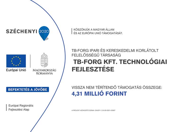 A TB-Forg Kft. sikeresen pályázott az OFA Nonprofit Kft által kiírt „Út a jövőbe/2019” és a GINOP 1.2.9-20-2021 „Hátrányos helyzetű településeken működő mikro- és kisvállalkozások fejlesztéseinek támogatása” kiíráson, amelynek eredményeként CNC megmunkáló központtal, csavarkompresszorral, mérő és kiegészítő eszközökkel gazdagodott a vállalkozás.